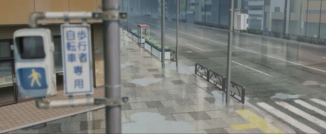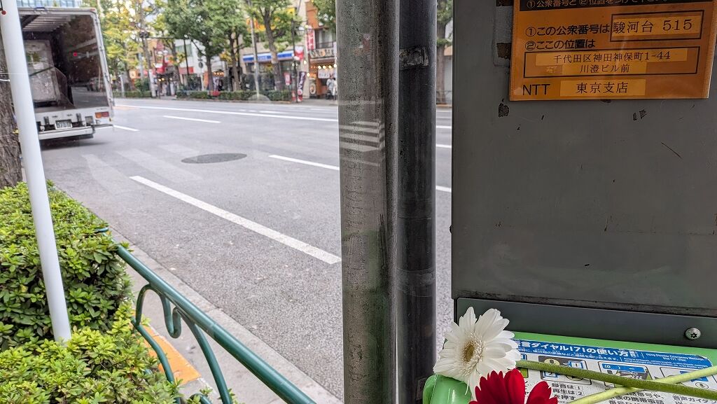 後述する他の舞台に近い場所(カトリック神田教会付近)にも電話ボックスがありますが、柵や車線の数や植え込みなど、こちらのほうが作中に出てくる電話ボックスに近いと思います。