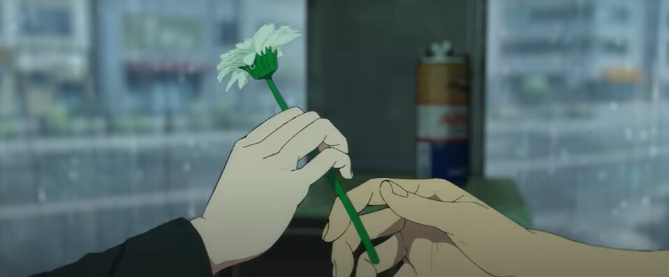 花屋さんの扉には、聖地巡礼の必需品として赤白のガーベラの花を売り出すレゼの張り紙も。